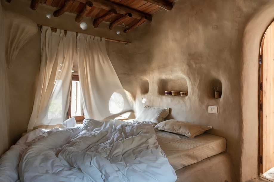 The mud structure is strengthened with straw and water, while a stone masonry base and eucalyptus beams support a carefully designed roof. “Contrary to assumptions, mud is a very safe material to build a house with. We engaged in daily stomping and dancing rituals, mixing the mud with straw and water to give it strength, all while playing music from all over the world,” Raghav Kumar adds.