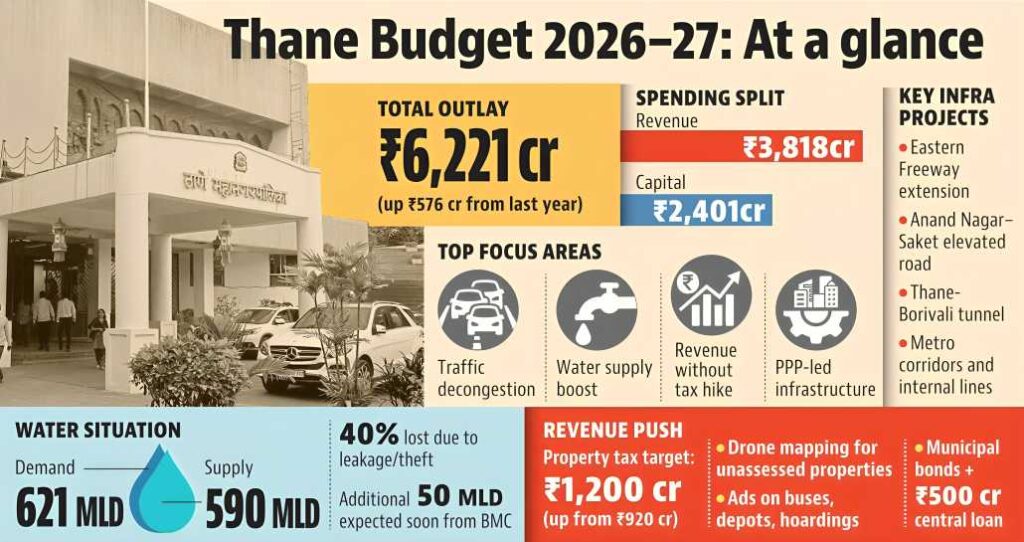 The Thane Municipal Corporation (TMC) on Monday presented a Rs 6,221-crore budget for the financial year 2026–27, emphasising revenue growth without imposing additional taxes, while prioritising infrastructure upgrades, traffic management and improved water supply.
